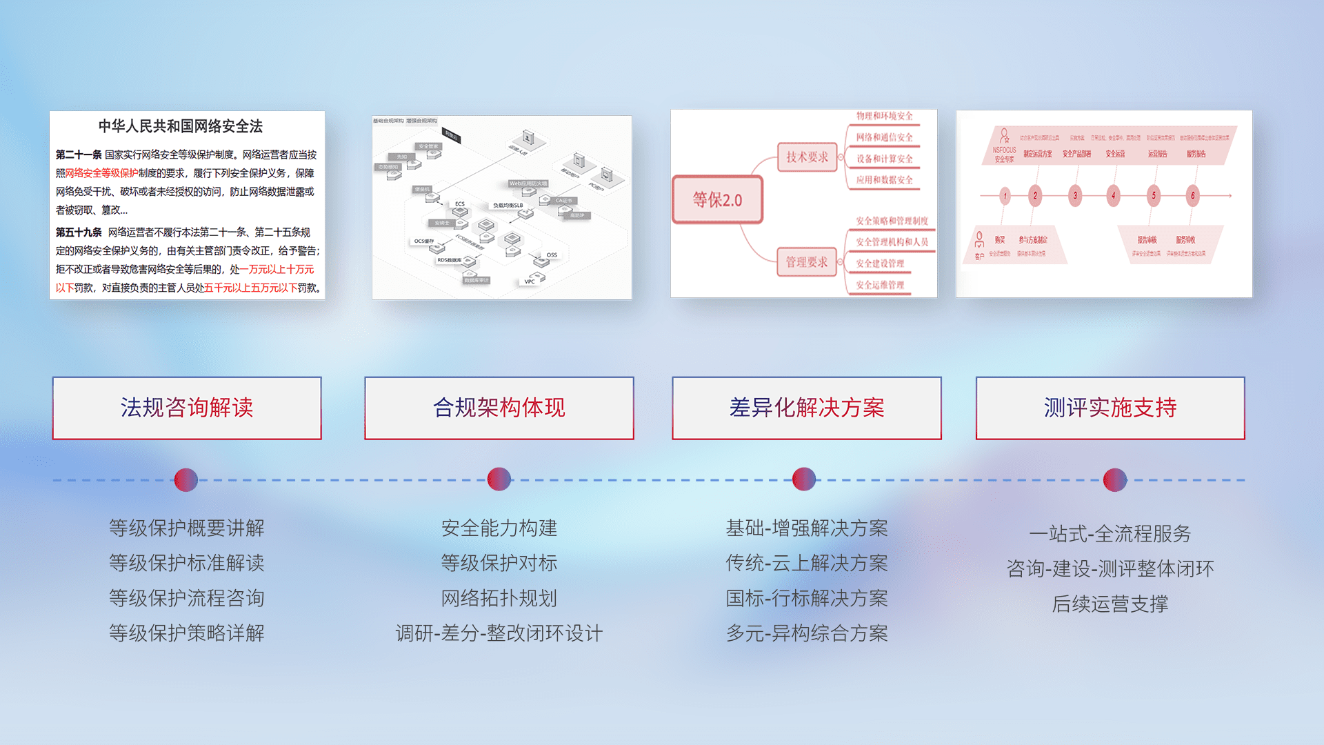 通过专业的法律咨询解读、、、合规架构体现、、、差异化解决方案、、测试实施支持等服务,,,为客户量身打造等保合规体系。。。