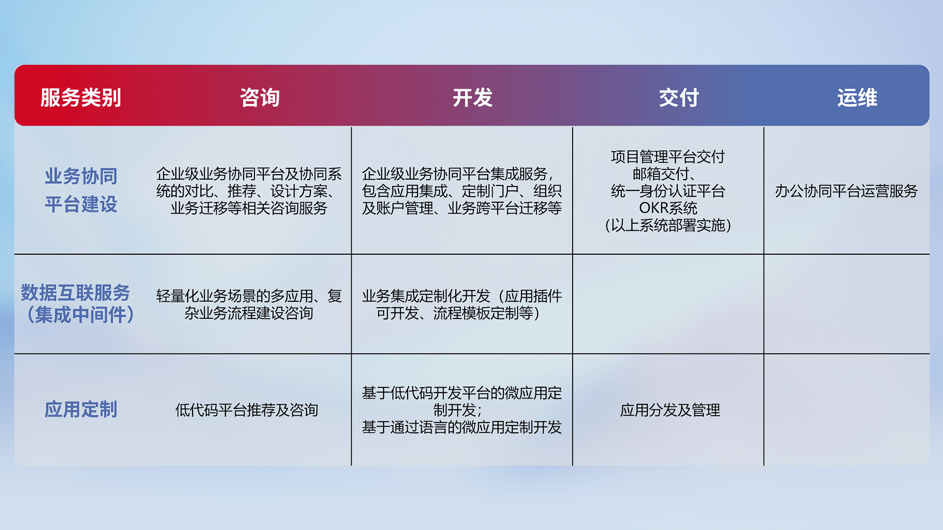 针对钉钉、、、企微、、、、IDaas等平台级产品提供产品的规划、、、、方案、、交付、、、、定制化开发等服务,,,实现如统一协同办公、、智能客户服务、、、混合会议管理、、、智能数据查询、、、、等业务场景,,实现数字化转型。。